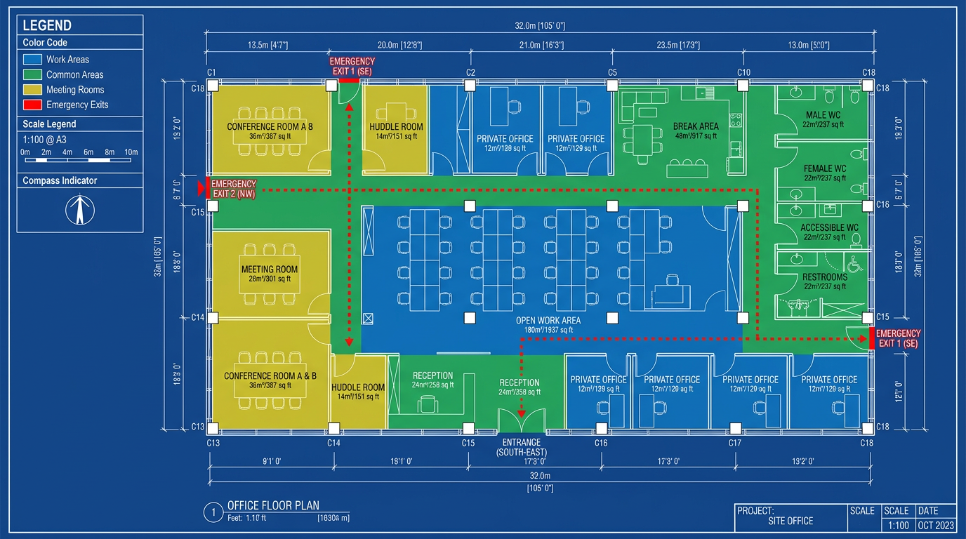 Generate a professional office floor plan blueprint. Show: workstations, meeting rooms, break areas, restrooms, entrances/exits, emergency routes. Use standard architectural symbols (doors, windows, furniture). Include measurements and dimensions in feet/meters. Color coding: blue for work areas, green for common areas, yellow for meeting rooms, red for emergency exits. Add compass indicator and scale legend. Layout: clean technical drawing style, architectural precision, labeled rooms with square footage. 16:9 ratio, blueprint style with white lines on blue background.